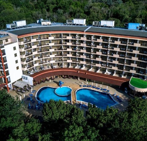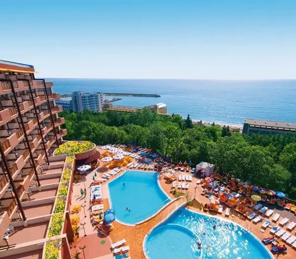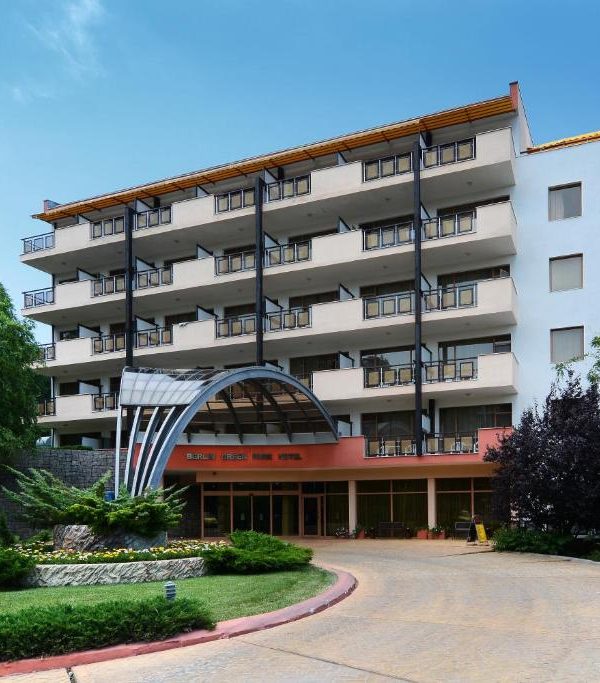 Berlin Green Park Hotel 4★ is a serene retreat nestled in the verdant surroundings of Golden Sands, Bulgaria, only 300 meters from the pristine beach. The hotel boasts 218 spacious rooms and suites, each equipped with modern amenities such as air conditioning, satellite TV, minibar, and private balconies offering stunning views of the Black Sea or the lush parkland. Guests can unwind by the outdoor or indoor swimming pools, enjoy the sauna, or stay active in the well-equipped fitness center.
