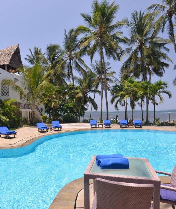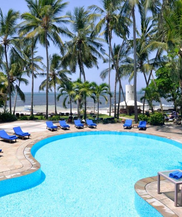Located directly on the sun-drenched sands of Bamburi Beach, Severin Sea Lodge is an oasis of peace designed in warm Swahili style. The lodge offers 188 guest rooms and bungalows—ranging from cozy Standard rooms to deluxe suites—each equipped with air-conditioning, private balcony or terrace, mosquito nets, minibar, safe, and free Wi‑Fi. Surrounded by lush tropical gardens, the property features two freshwater pools (including one with a Jacuzzi), a rooftop terrace, and ample sun loungers with beach access just steps away.